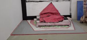 Die in Santiago de Chile geborene, in Berlin lebende Künstlerin Constanza Carvajal schafft außergewöhnliche Textilobjekte an der Schnittstelle zwischen Malerei und Skulptur, zwischen Innen und Außen, zwischen dem öffentlichen und privaten Raum. Aus weißen Leinwandbahnen und Unistoffen, die sie mit geometrischen und figurativen Mustern bemalt, gestaltet sie einzigartige immersive Wohnlandschaften und Leseräume, die aus überlebensgroßen, mit Kissen ausgestopften Matratzen und anderen häuslichen, alltäglichen, zum Teil zweckentfremdeten Utensilien bestehen. Auf der Vorderseite sind sie mit Bildern bedeckt, für die Constanza schwarze Siebdruckfarbe benutzt. Sie muten wie ein Mosaik aus persönlichen und kollektiven nichtlinearen Erzählungen und Erinnerungen an und beziehen sich auf Künstlerinnen, Motive und Ereignisse, die Constanza persönlich bewegen. Auf der Rückseite schlängelt sich ein rotes Wellenmuster durch den Stoff.